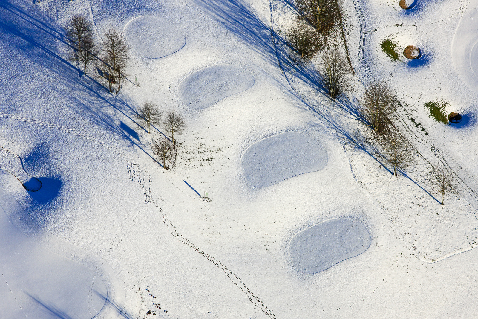 Aerial view of the wintry golf course of the Thailing Golf Club in Steinöring, Ebersberg, Upper Bavaria