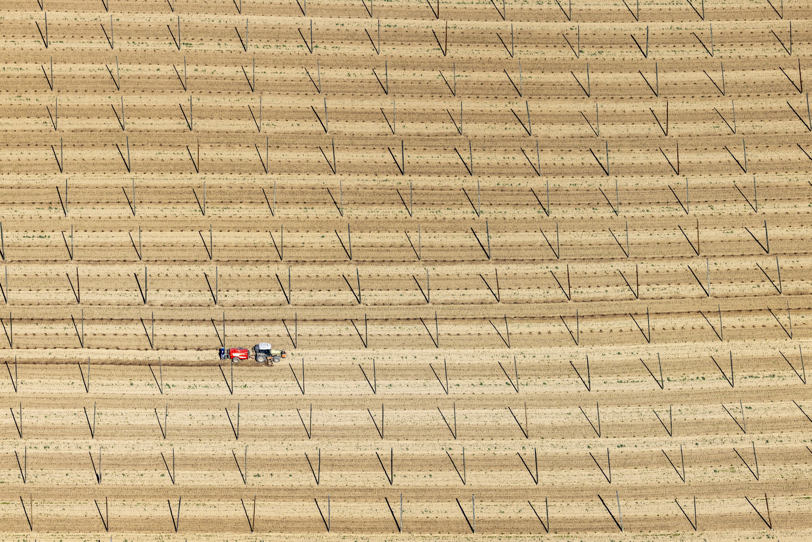 Luftbild von der Arbeit im Hopfenfeld in Schatzhofen, Landshut, Niederbayern