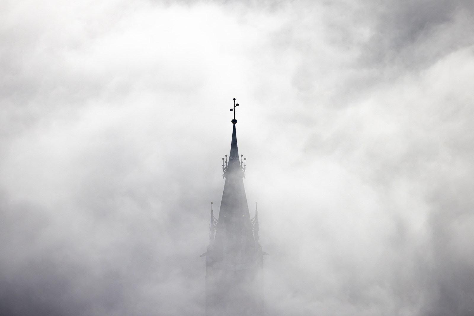 Luftbild vom Kirchturm der Martinskirche in Landshut im Nebel, Niederbayern