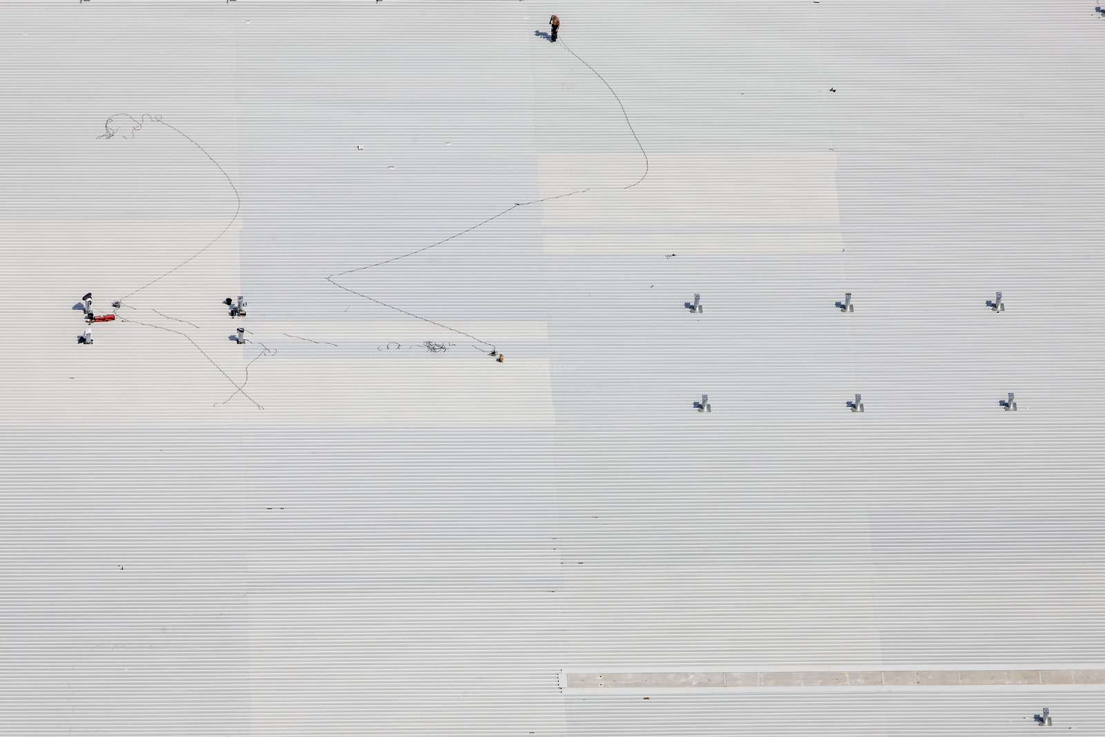 Luftbild von einem Arbeiter auf dem Dach des Einkaufzentrums