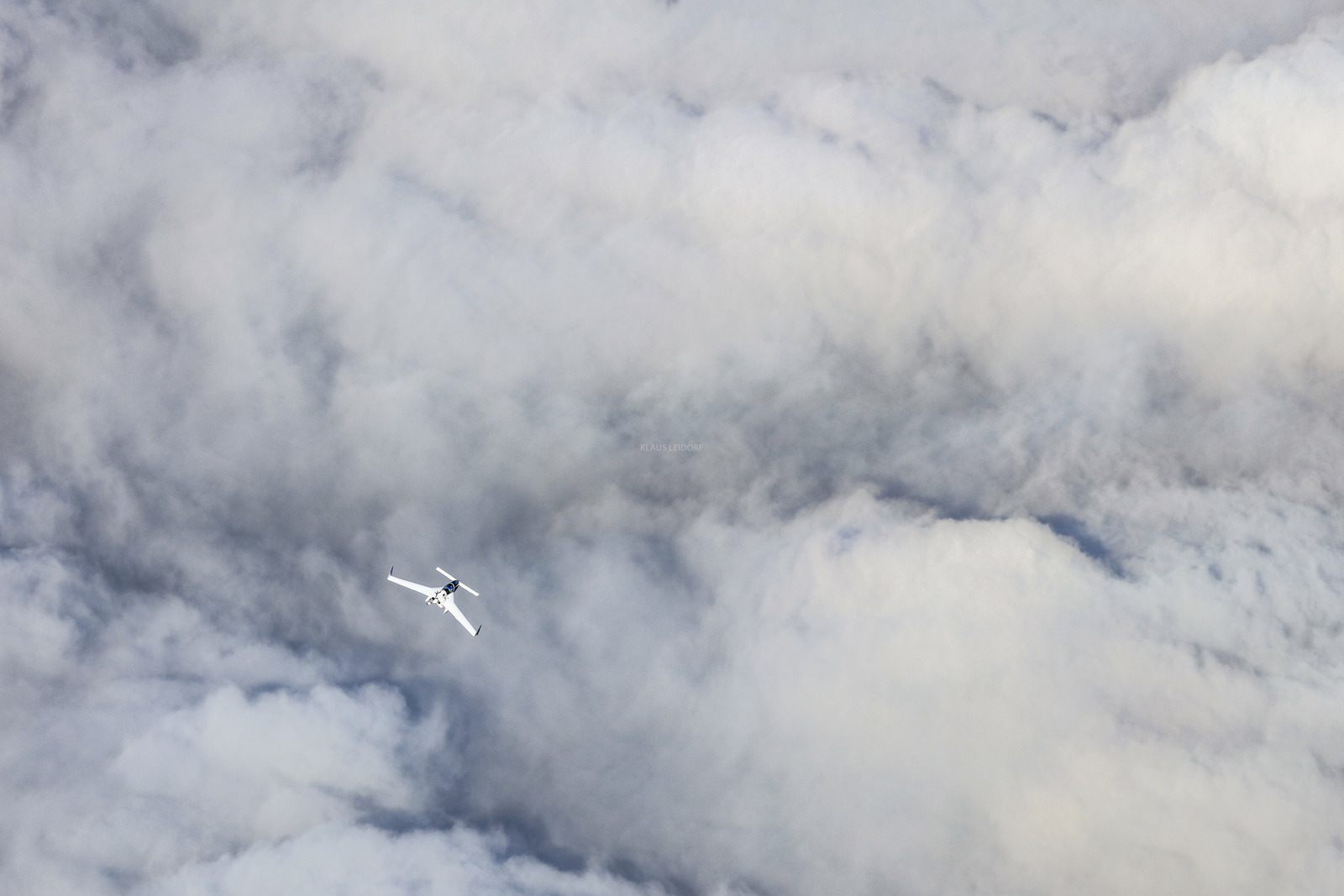 Luftbild von einem Entenflugzeug Gyroflug SC01 Speed-Canard über den Wolken