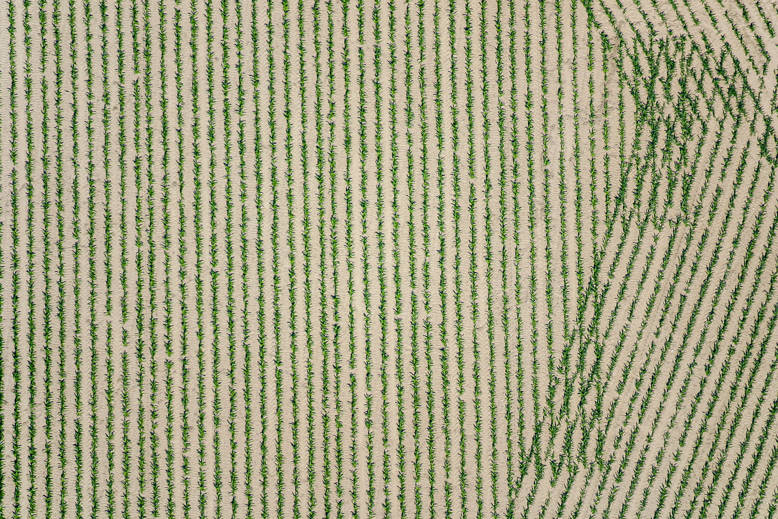 Cornfield – Luftbild von einem Maisfeld mit ganz jungen Pflanzen in bizarrem Muster – Aerial view of a cornfield with very young plants in a bizarre pattern