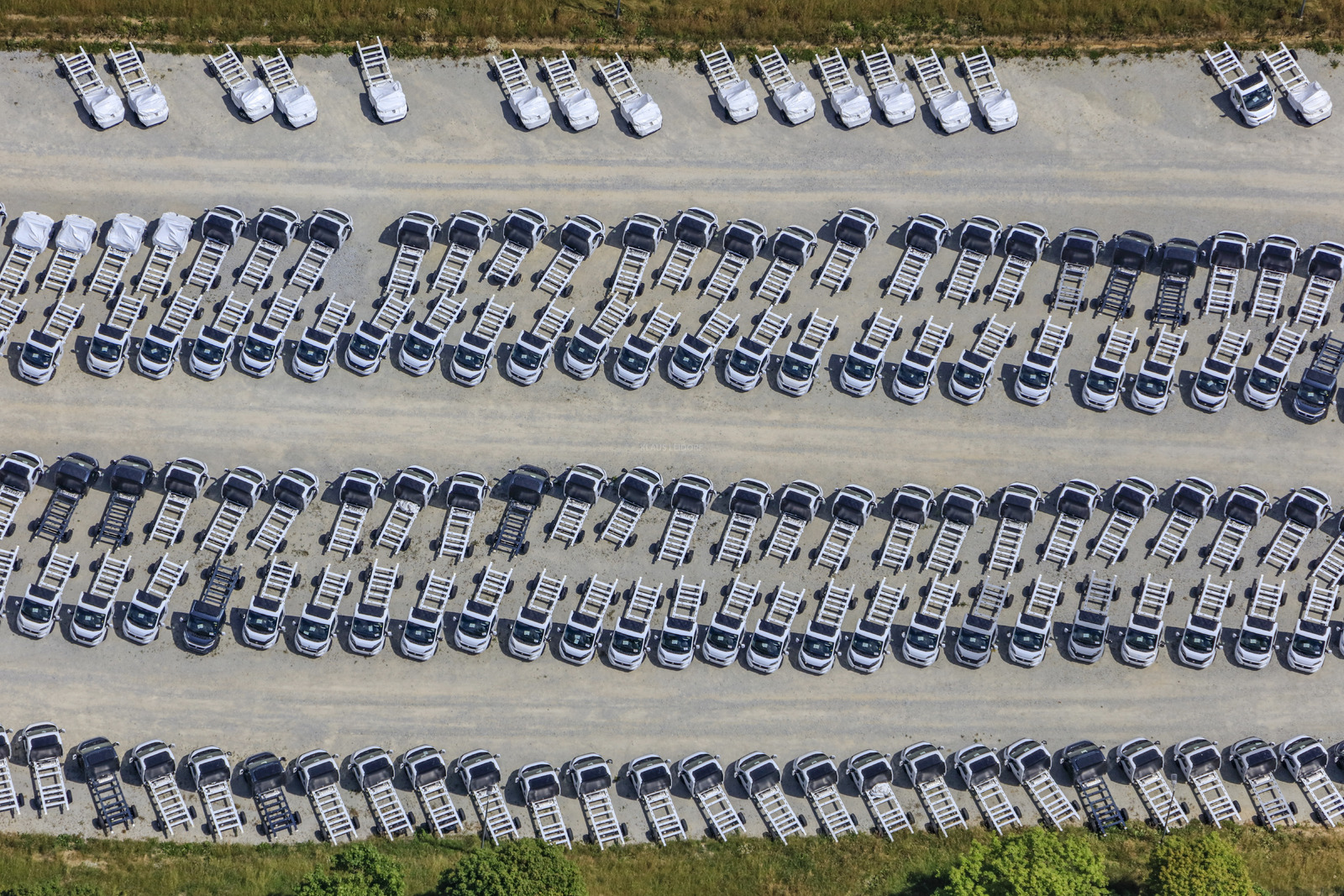 Luftbild von neuen Fahrgestellen, die auf ihren Umbau zum Wohnmobil warten in Freyung-Grafenau, Niederbayern